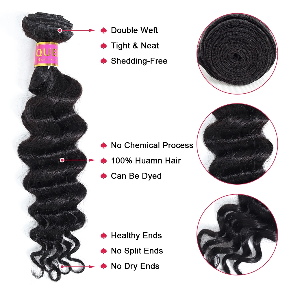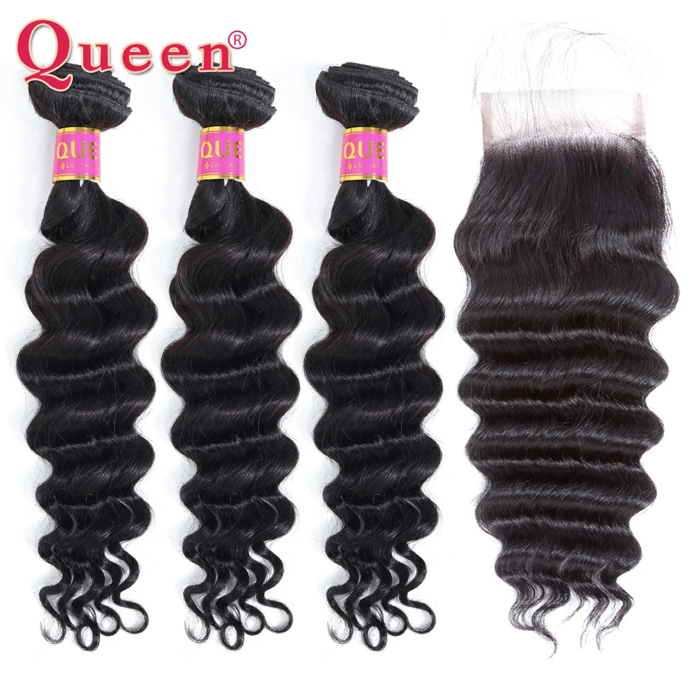 Queen Products Loose Deep Wave Bundles With Closure 3/4 Bundles With Closure 100% Remy Malaysian Ha
